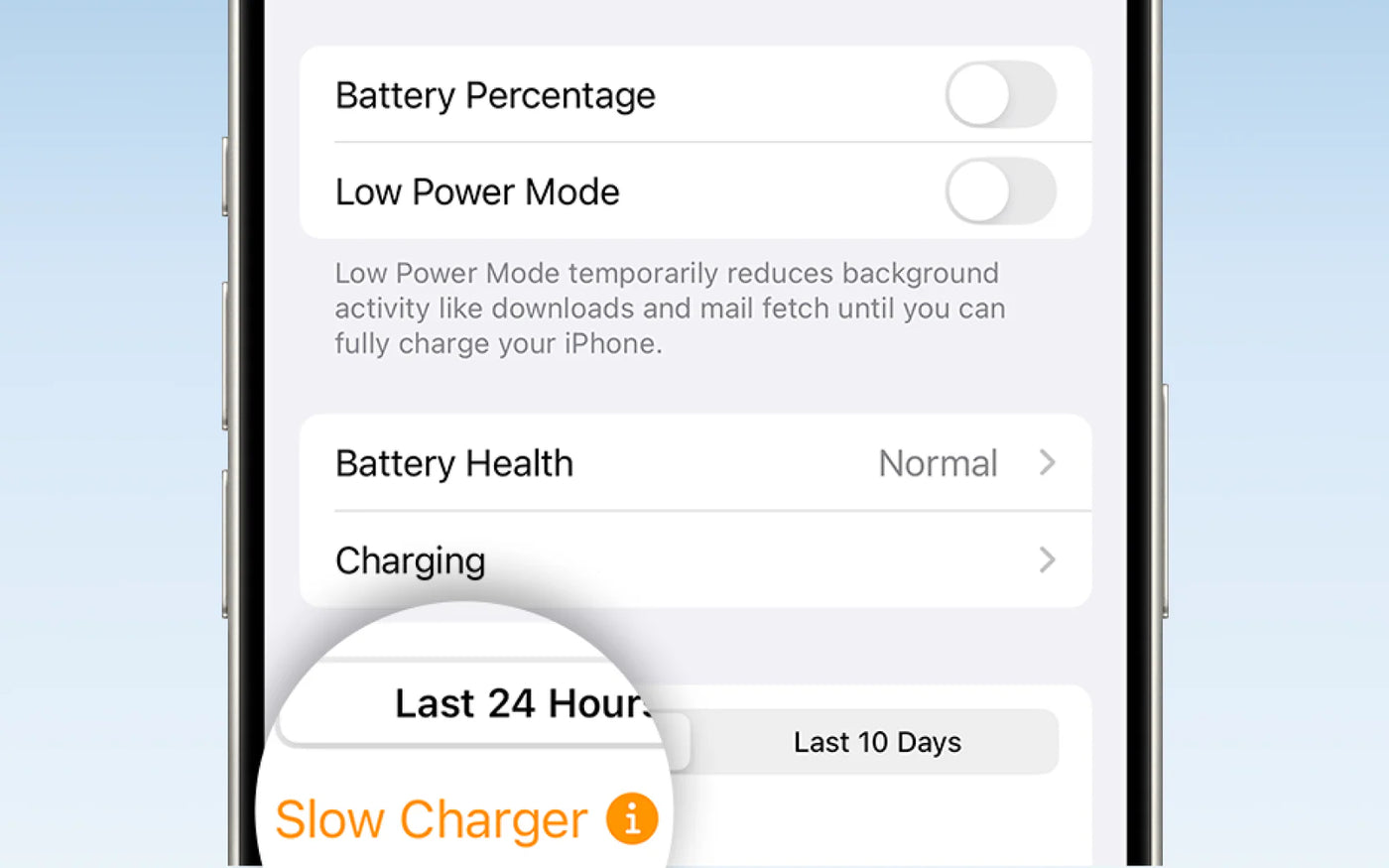 To manage charging speed and temperature, power may be reduced when heat is detected. This helps lower device temperature without noticeably affecting speed or performance. With iOS 18, a "Slow Charger" notification may appear as part of the system's software strategy. Charging remains stable and safe, with no negative impact on the iPhone.